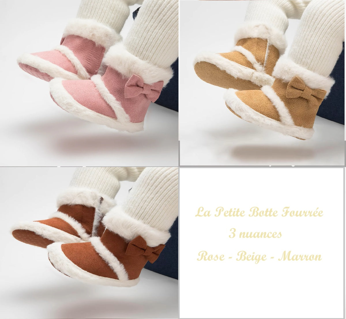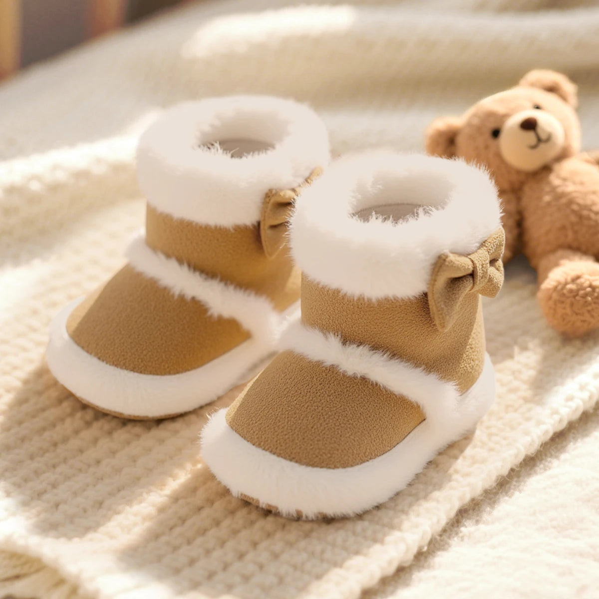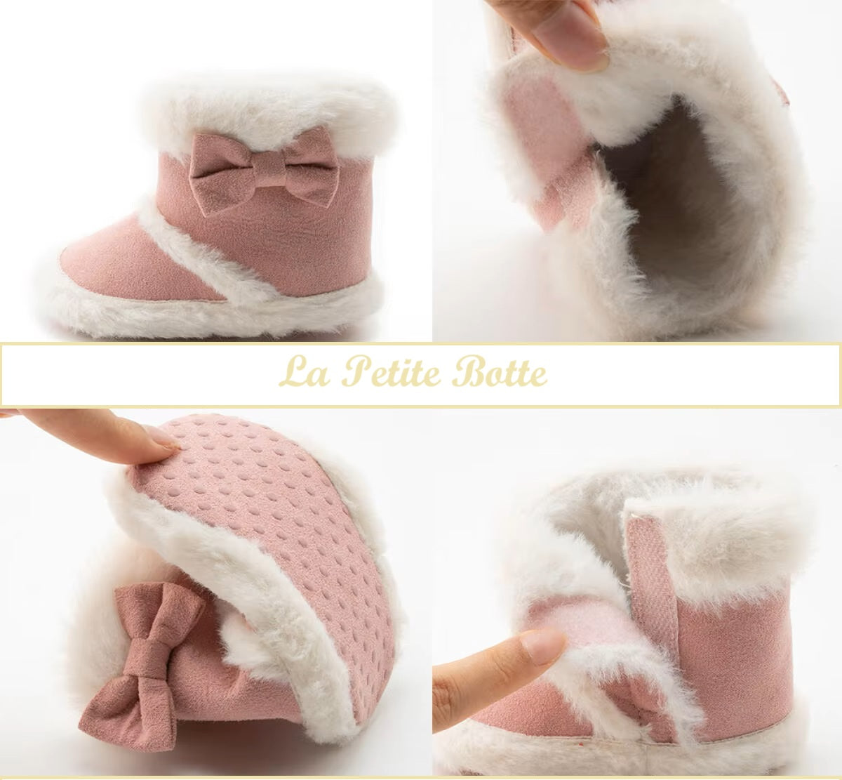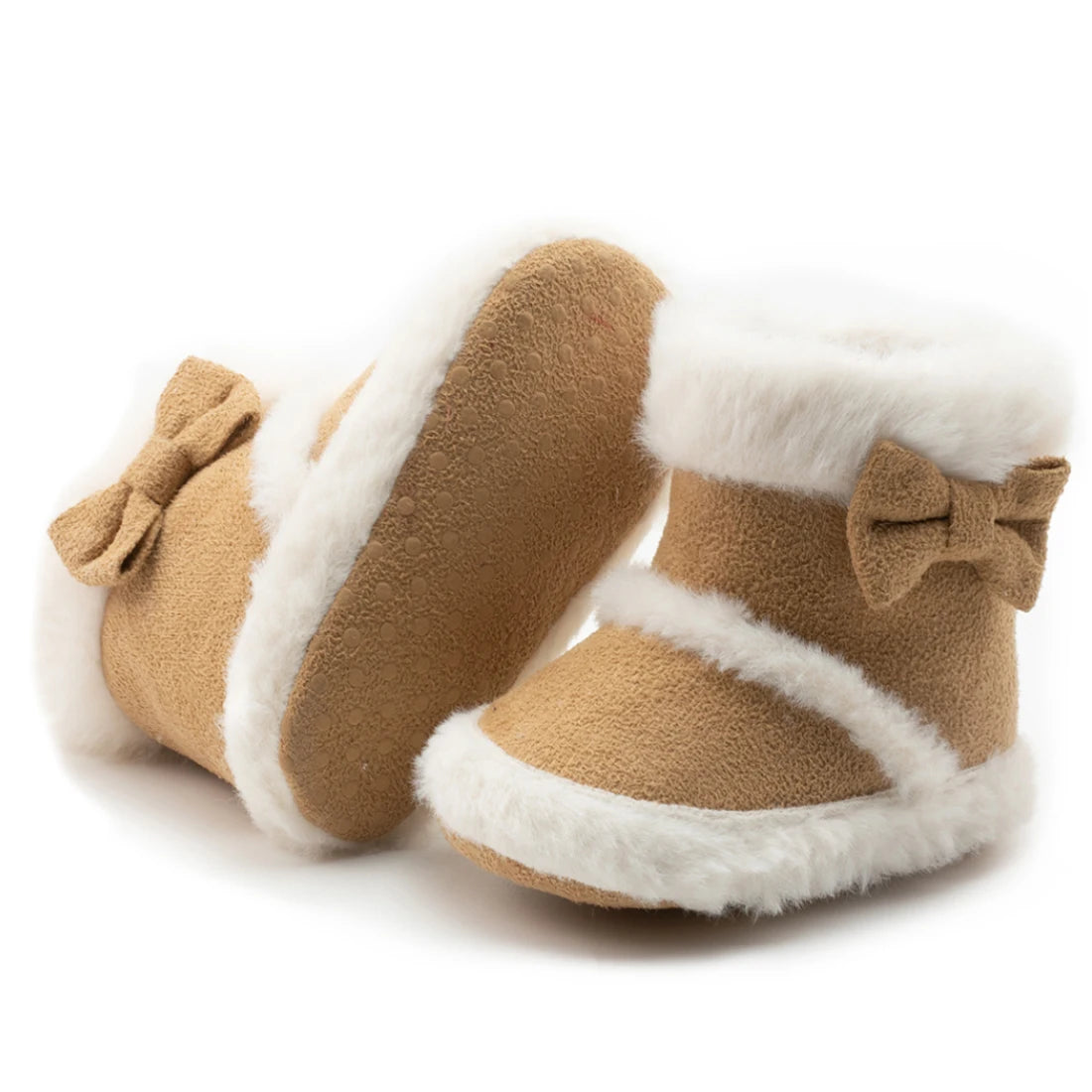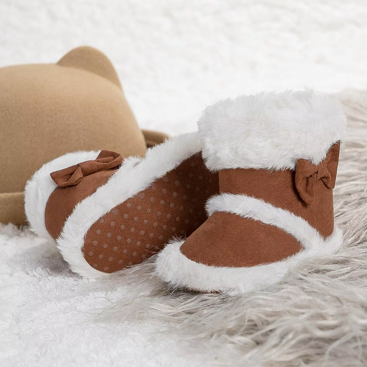 Un design élégant avec une finition en fausse fourrure, un joli noeud sur le côté et une semelle antidérapante apportent look stylé )à toutes les tenues vestimentaires hivernales de votre petite demoiselle !