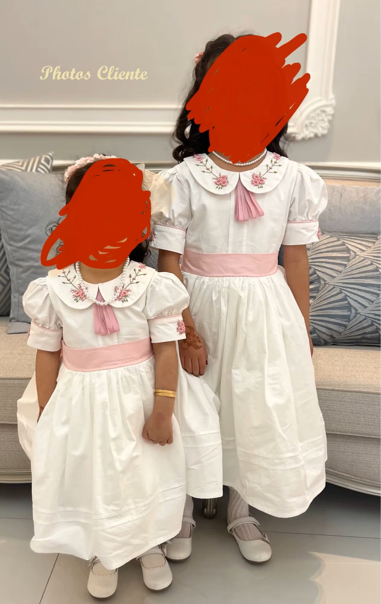 On souligne la grâce de son corsage au col claudine sublimement brodé de motifs floraux, décorés de plis fins et ses manches ballons agrémentées d'une broderie florale délicate.  Une découpe évasée , une grande ceinture de ton rose et un bas de robe agrémenté de 2 petits plis décoratifs au niveau de l'ourlet.