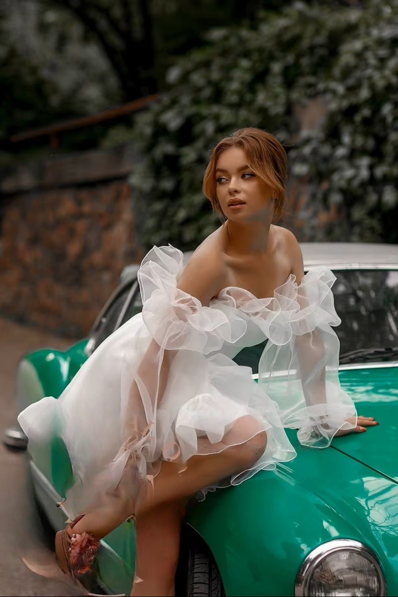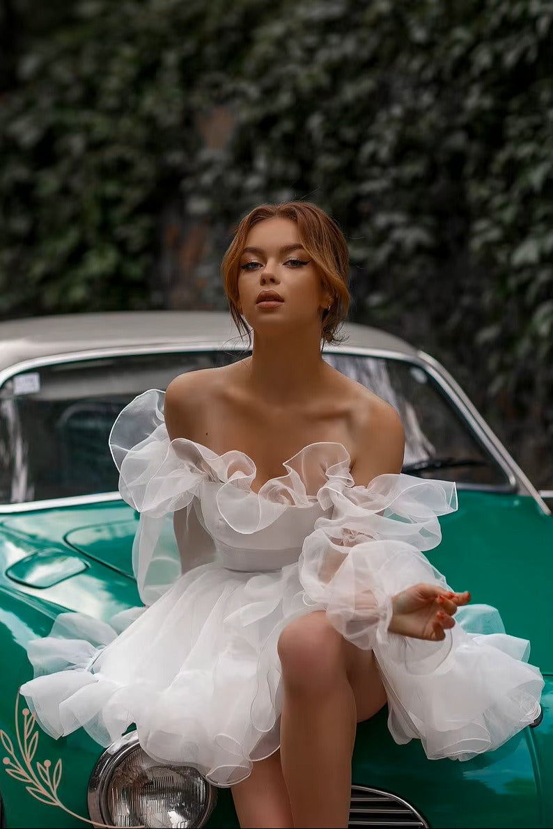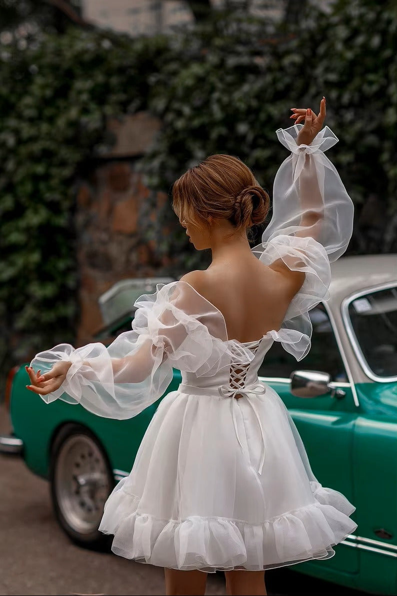 Elle se démarque par son délicat haut volanté doté de manches bouffantes réalisées en voile d'organza transparent qui apportent une touche tendance et raffinée. Le bustier met en valeur tout le haut du buste jusqu'à la taille soulignée par une petite ceinture, tandis que l'arrière présente un dos nu échancré ultra glamour, scellé par un laçage .