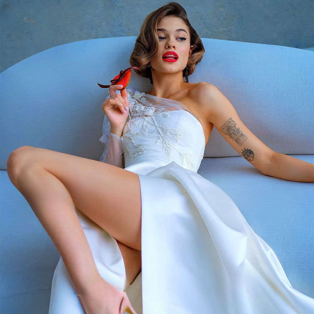 Raffinée, la robe Monterey présente une coupe asymétrique à une manche, réalisée en voile d'organza délicat, richement décoré de dentelle à motifs floraux perlés. Un sublime drapé qui vient se superposer sur le bustier corset en forme de coeur, laissant une épaule dénudée sublimé par un dos nu, scellé par une fermeture zippée discrète. Une petite ceinture intégrée souligne et affine à la taille, apportant une belle silhouette élancée.