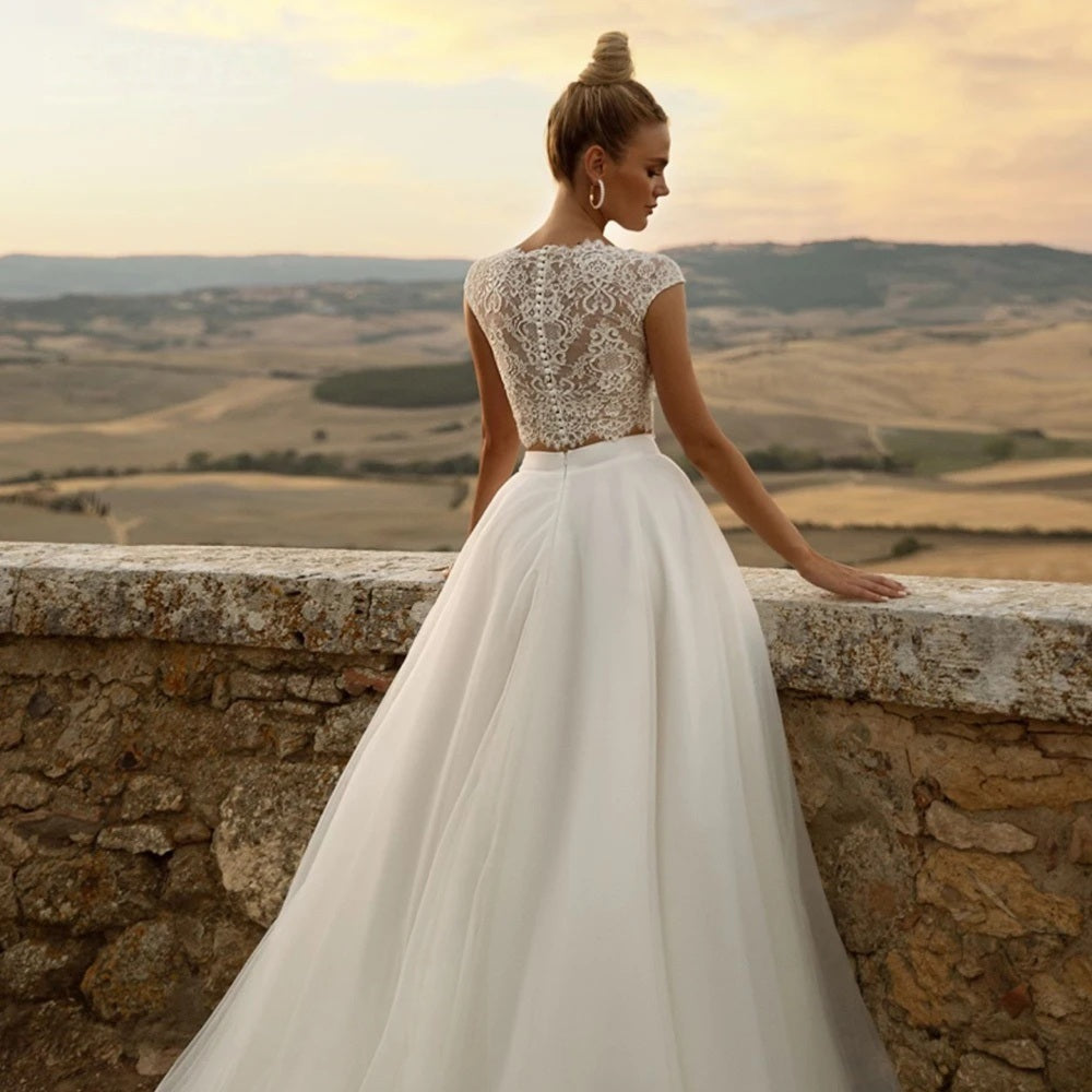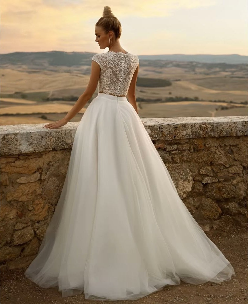 L'ensemble HAMPTON est une alternative élégante à la robe de mariée traditionnelle, garantissant une allure à la fois raffinée et confortable pour le grand jour. Il est composé d'un top en dentelle au charme indéniable, boutonné au dos et d'une jupe en organza, montée sur ceinture, qui assure une fluidité et un confort à chaque mouvement et scellée par une fermeture zippée discrète au dos.