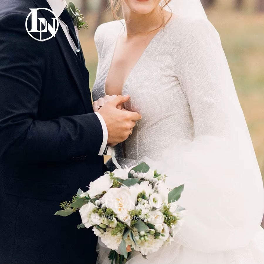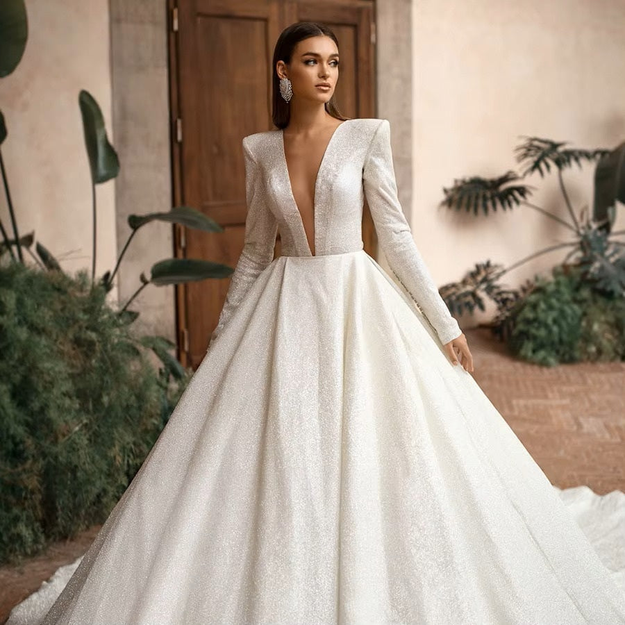 Une silhouette gracieuse grâce à sa coupe A-line et sa ligne raffinée. Le décolleté en V étroit et profond apporte un charme délicat et subtil, tandis que l'arrière joue la carte de la transparence sur un dos en V échancré, scellé par des boutons artisanaux. Les manches longues, parées de petits boutons, complètent un design pensé pour une célébration élégante et intemporelle.