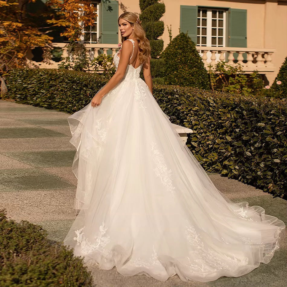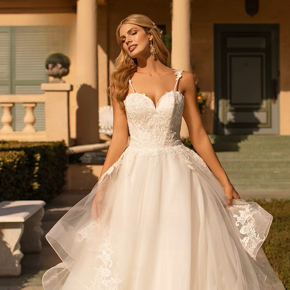 Une robe de mariée à l'allure princière, confectionnée de tulle délicat et d'organza embellie d'appliques en dentelle et déclinée dans deux nuances au choix que vous pourrez porter selon votre teint, de ton ivoire (telle que les photographie de présentation) ou en ton blanc.