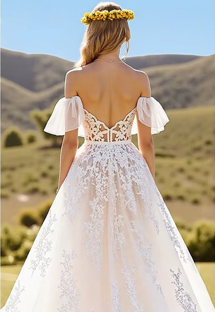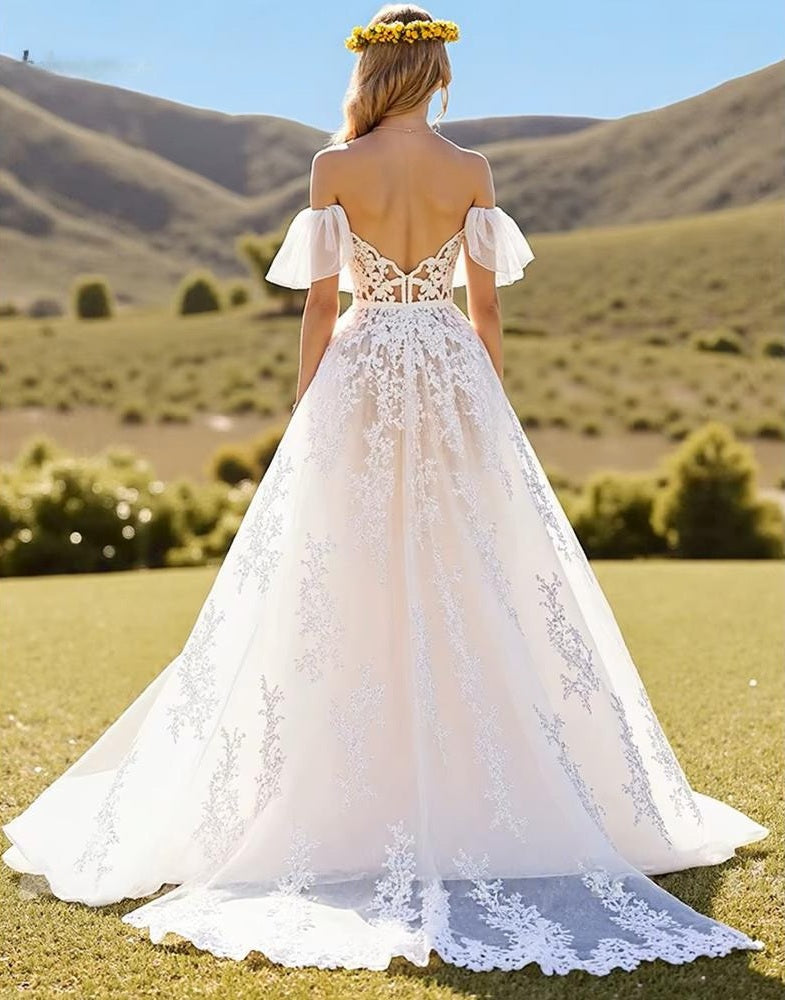 Un design qui souligne harmonieusement la silhouette mise en valeur grâce à son bustier structuré au décolleté coeur, agrémenté de motifs appliqués en dentelle, qui met en valeur tout le haut du buste et scellé au dos par une fermeture zippée discrète. Les manches volantées tombantes, qui laissent les épaules dénudées, apportent une touche poétique raffinée.