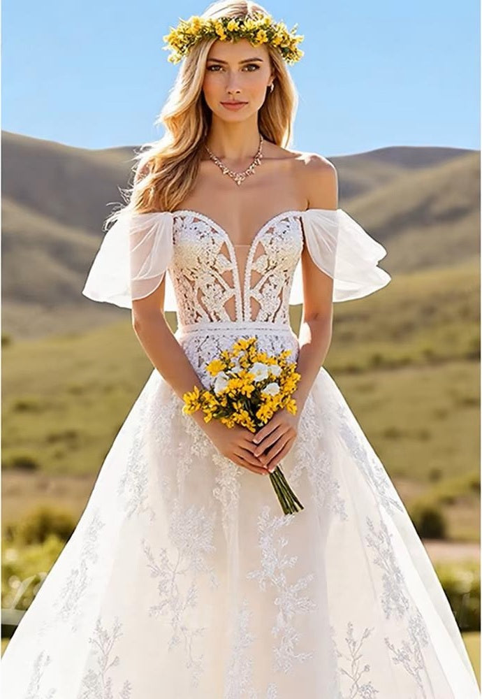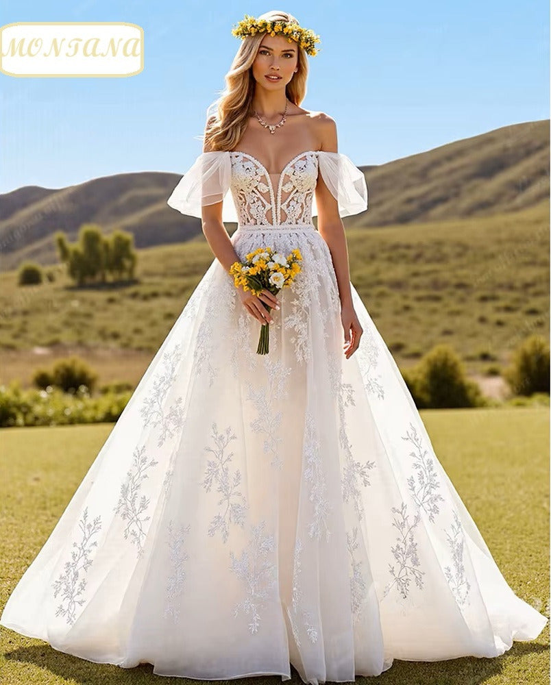 La robe de mariée MONTANA est réalisée en tulle délicat brodé de dentelle, paré d'appliques en dentelle et déclinée dans deux nuances au choix que vous pourrez porter selon votre teint, en ton blanc (telle que les photographie de présentation) ou un ton ivoire (blanc cassé).