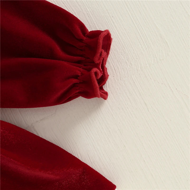 Déclinée en velours polyester de ton rouge bordeaux, dotée d'une magnifique encolure smockée volantée contrastée blanche ouvragée de motifs festifs joliment brodés, cette jolie robe body présente une coupe évasée plissée au niveau de la taille et un large galon blanc au bas de la robe. Les manches légèrement amples et resserrées aux poignets ajoutent une touche raffinée.
