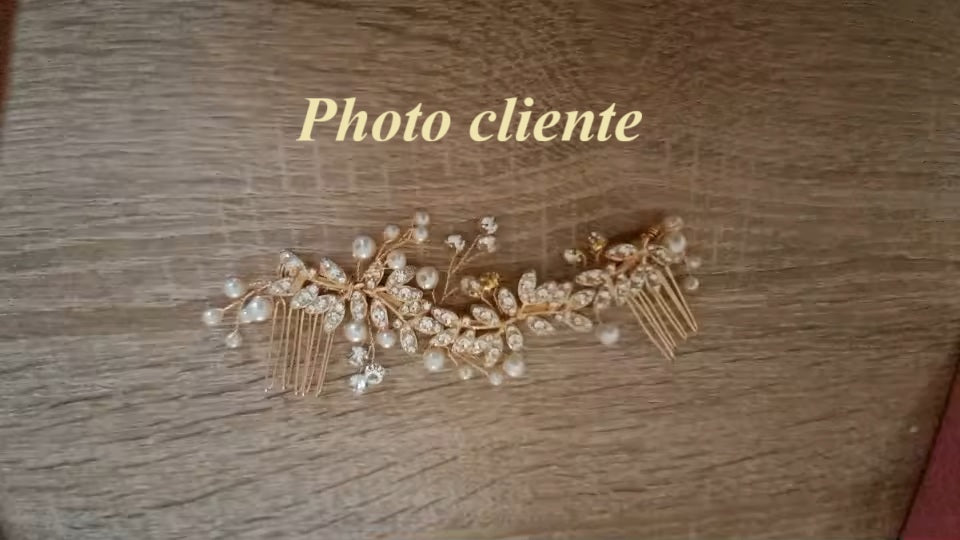 Entièrement assemblé à la main et confectionné en alliage de zinc, sous fond d'or, embelli de petites perles nacrées et de cristal, pensé pour toutes les coiffures des mariées, cette délicate création est l'accessoire de cheveux romantique et raffiné qui finalisera et sublimera votre coiffure pour votre grand jour !