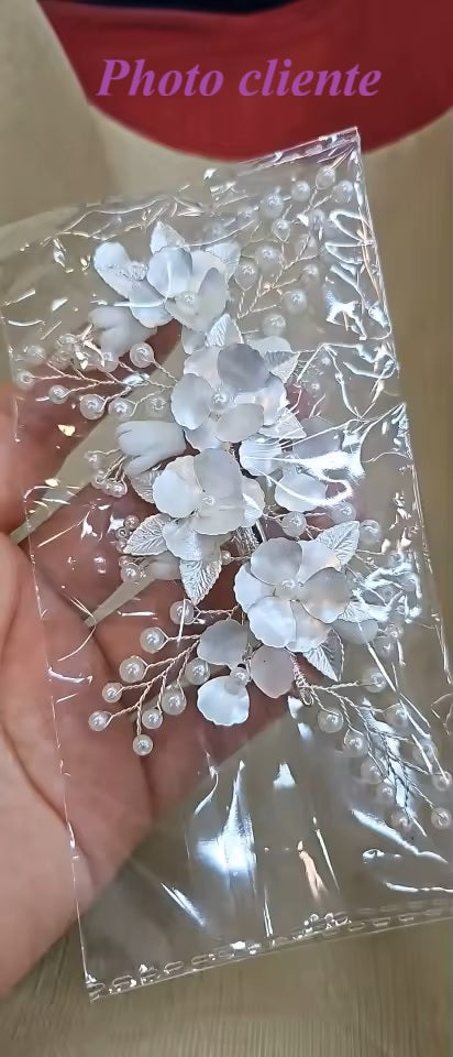 Entièrement assemblé à la main et confectionné en alliage de zinc, embelli de petites fleurs et de perles nacrées, pensé pour toutes les coiffures des mariées, cette délicate création est l'accessoire de cheveux romantique et raffiné qui finalisera et sublimera votre coiffure pour votre grand jour !