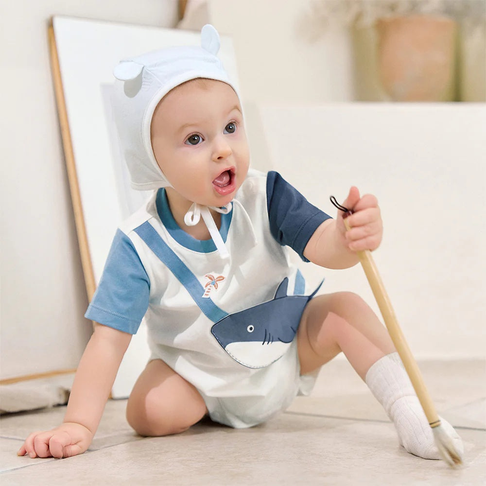 Confectionnée de coton sur fond blanc, dotée d'une encolure arrondie et de manches contrastées, cette combi courte arbore de jolis imprimés marins Pratique et élégante, elle est pressionnée sur le côté au niveau du cou et à l'entrejambe pour un habillage facile.