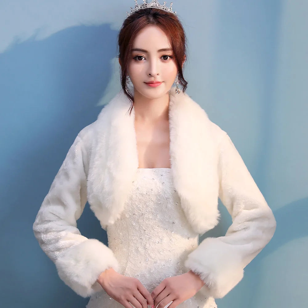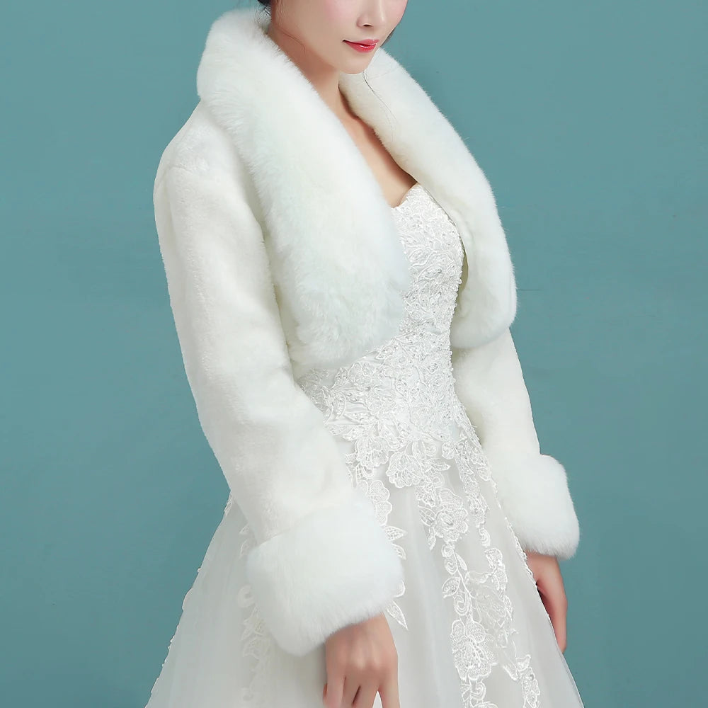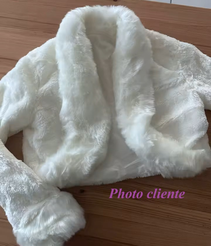 Réalisé en fausse fourrure synthétique, décliné dans un ton blanc cassé, ouvert sur le devant, il est doté d'un col à revers gonflé avec un design épais sur l'encolure et les poignets. Elégant et pratique, il garanti confort et chaleur pour toutes les futures mariées d'hiver.