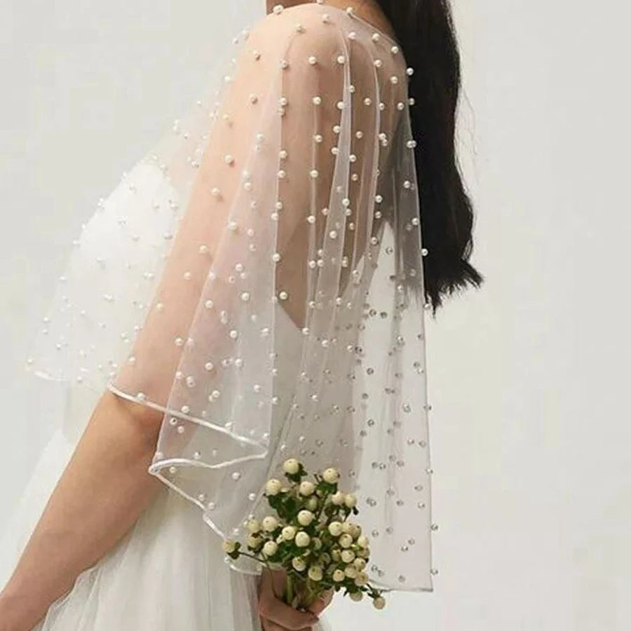 Réalisée en voile transparent, fin et délicat, parsemé de petites perles nacrées cousues à la main, cette cape courte de mariage, à enfiler, embellira votre robe de mariée.