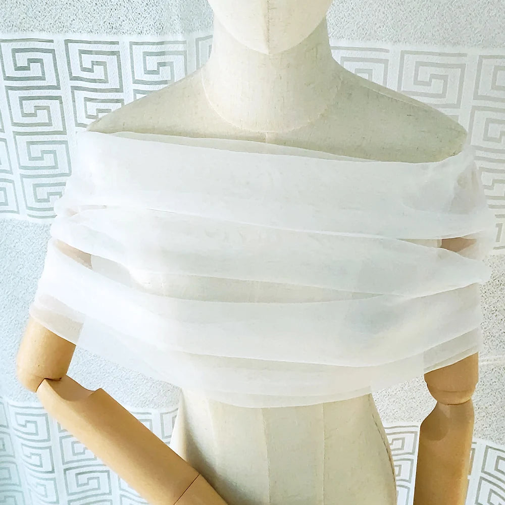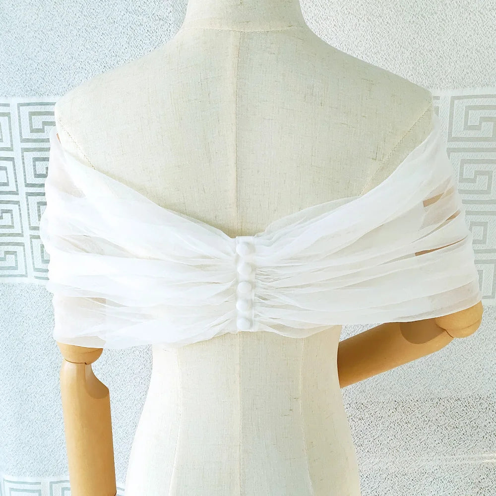 Conçue avec soin, pour être portée par-dessus votre robe de mariée, cette élégante étole de mariée est confectionnée dans un délicat tulle drapé et décliné dans 2 nuances au choix, blanche ou ivoire.