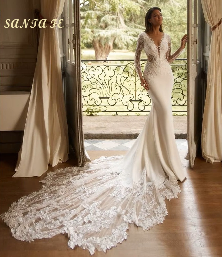 SANTA FE, est une robe de mariée sirène, confectionnée dans un tissu de crêpe, embelli par des broderies appliquées en dentelle délicate ornées abondamment de perles et de paillettes et déclinée dans deux nuances au choix que vous pourrez porter selon votre teint, de ton ivoire (telle que les photographie de présentation) ou en ton blanc.