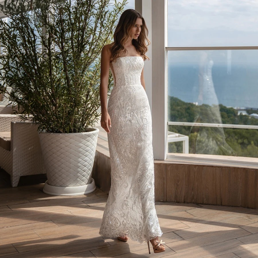 Sa coupe ajustée près du corps, offre un bustier sculpté qui dévoile avec sensualité, les épaules dénudées et un dos nu échancré scellé par une fermeture zippée discrète. Son design épouse à la perfection les courbes du corps, allongeant et affinant la silhouette tout en mettant en valeur la taille.