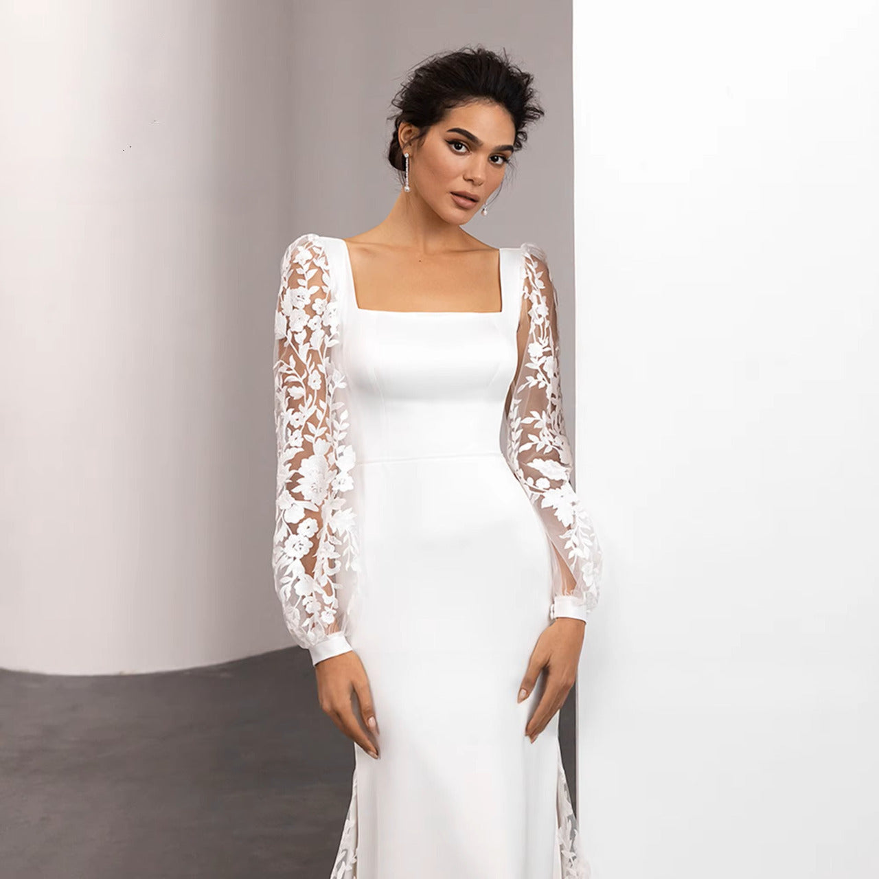 Sa coupe ajustée près du corps, offre un corsage à encolure carrée dotée de longues manches bouffantes réalisées en organza floral 3D qui apportent une touche de délicatesse romantique. L'arrière présente un dos nu échancré retenu par un ruban et scellé par une fermeture zippée discrète. Son design épouse à la perfection les courbes du corps, allongeant et affinant la silhouette tout en mettant en valeur la taille.
