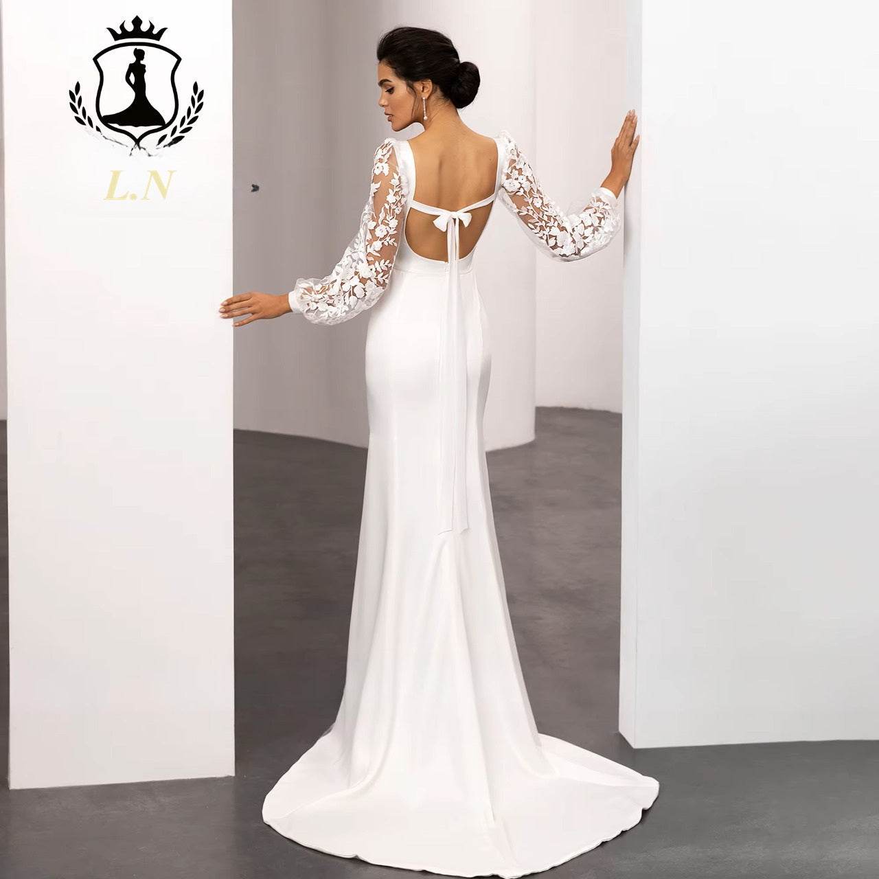 Le savoir-faire traditionnel et un design haute couture à la perfection du styliste étranger Louis N. IONA est une robe de mariée prestigieuse, empreinte de raffinement, pour le plus beau jour de votre vie !