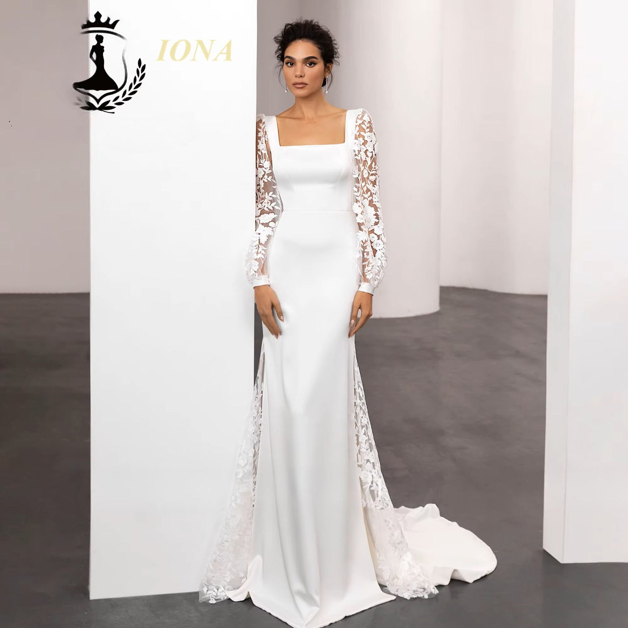 IONA est une robe de mariée sirène d'exception, confectionnée de textile satiné, de dentelle et d'organza, déclinée dans deux nuances au choix que vous pourrez porter selon votre teint, de ton ivoire (telle que les photographie de présentation) ou en ton blanc.