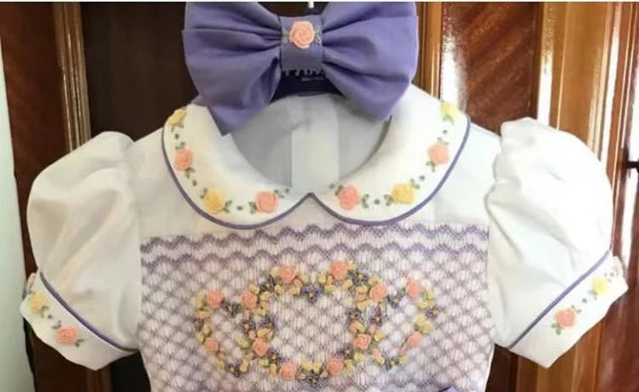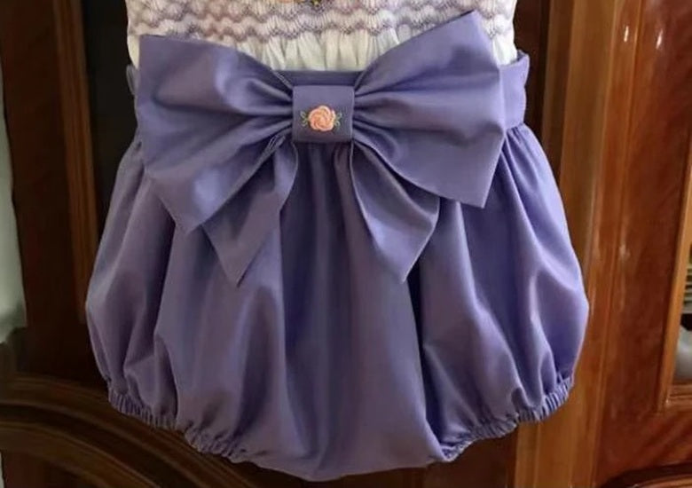 Le corsage smocké est embelli d'exquises broderies surpiquées de couleur réalisées à la main, montées d'un col Claudine brodé et festonné et de manches ballons ornées également de petites broderies. Il est boutonné au dos pour un habillage facile. Le bas de style bloomer présente de jolis plis qui offrent une légère ampleur, agrémenté d'un nœud surdimensionné, parée d'une jolie rose brodée qui ajoute une touche d'élégance.