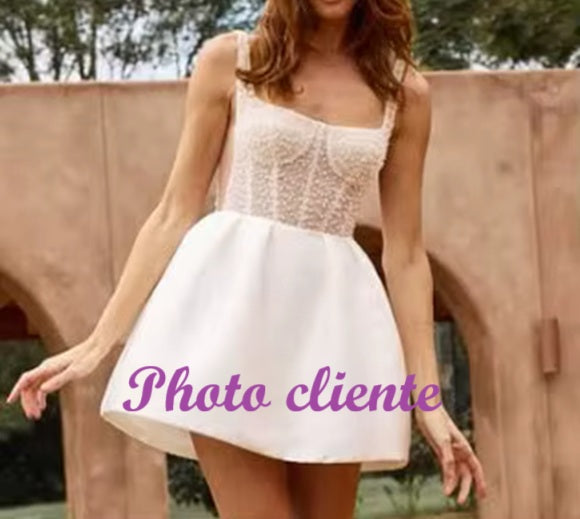 Cette robe de mariée courte se démarque par sa créativité en proposant une coupe stylée, fraîche et empreinte de modernité. Elle joue habillement avec un bustier en encolure carrée, ouvragé de perles nacrées, parfaitement ajusté, doté de découpes latérales, mettant en valeur le haut du corps et une jupe en satin, légère et vaporeuse qui vous laisse une toute liberté de vous mouvoir pendant votre journée de cérémonie.