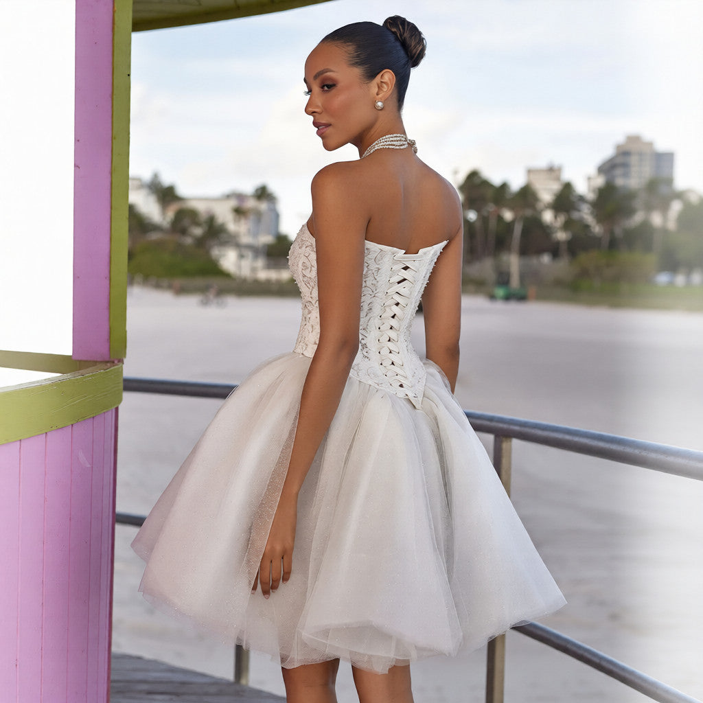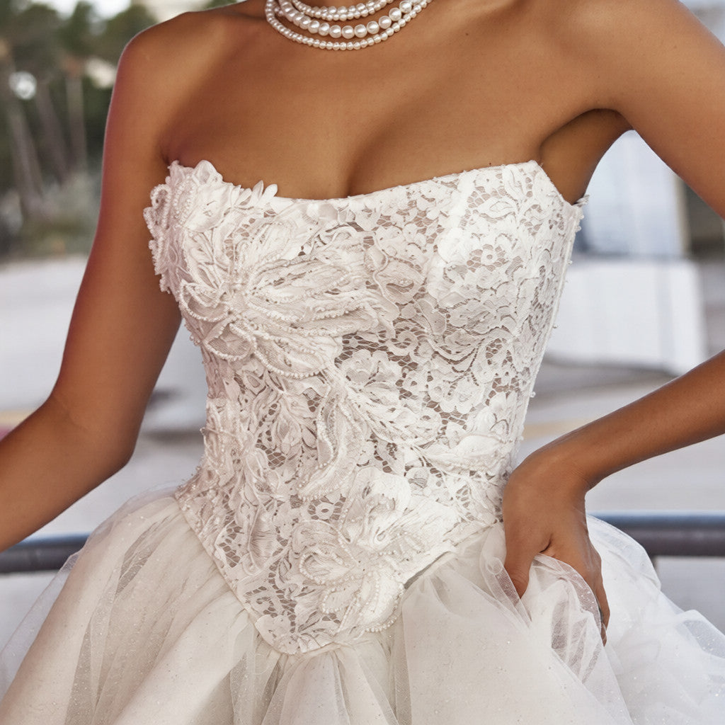 Un design stylé qui arbore un corset structuré, embelli de dentelle appliquée et de petites perles, doté d'un beau décolleté arrondi qui met en valeur la poitrine et d'une taille basque qui affine la silhouette. Le laçage au dos ajoute une touche délicate d'élégance raffinée.