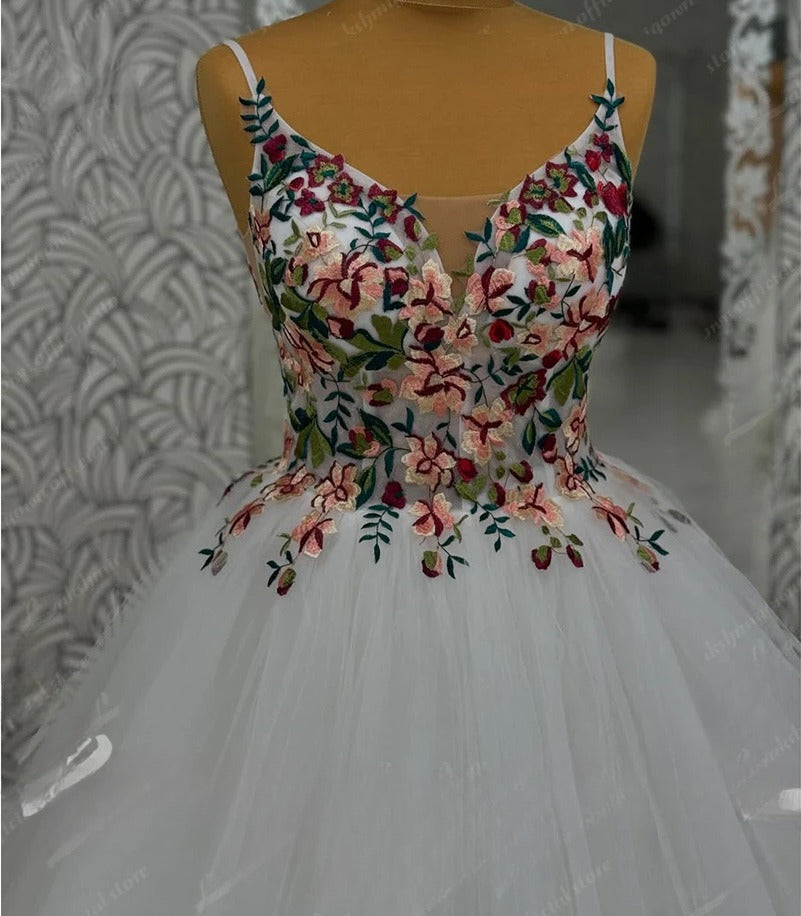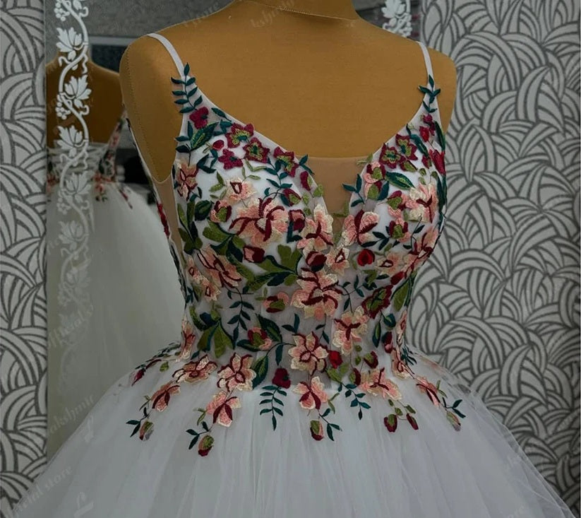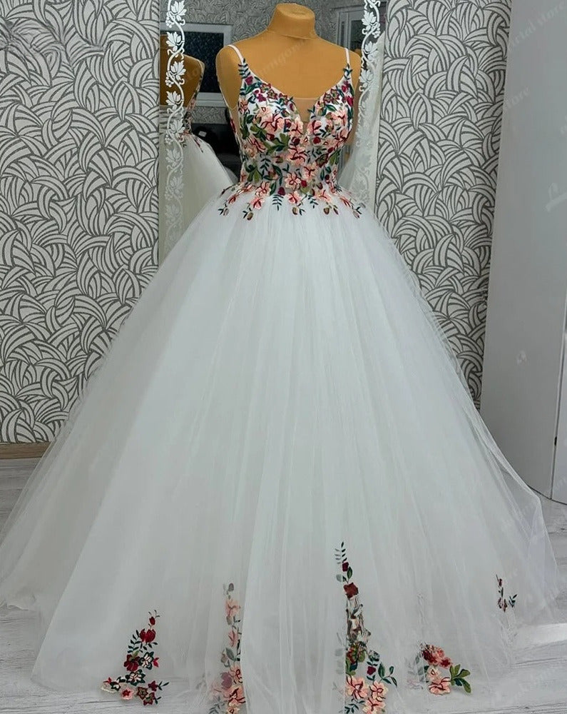 Une ode romantique à la féminité, la robe de mariée APONI est réalisée en tulle délicatement embellie d'appliques de broderies florales de couleur.