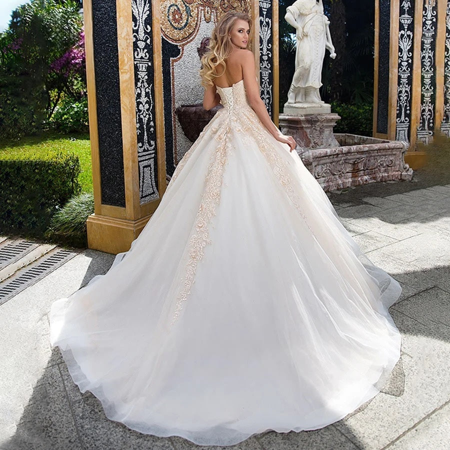 Un chef d'œuvre artisanal, qui se démarque par son bustier raffiné en forme de coeur embelli de broderies et scellé au dos par un laçage traditionnel qui assure un ajustement à la perfection. Les épaules dénudées apportent une touche sensuelle.