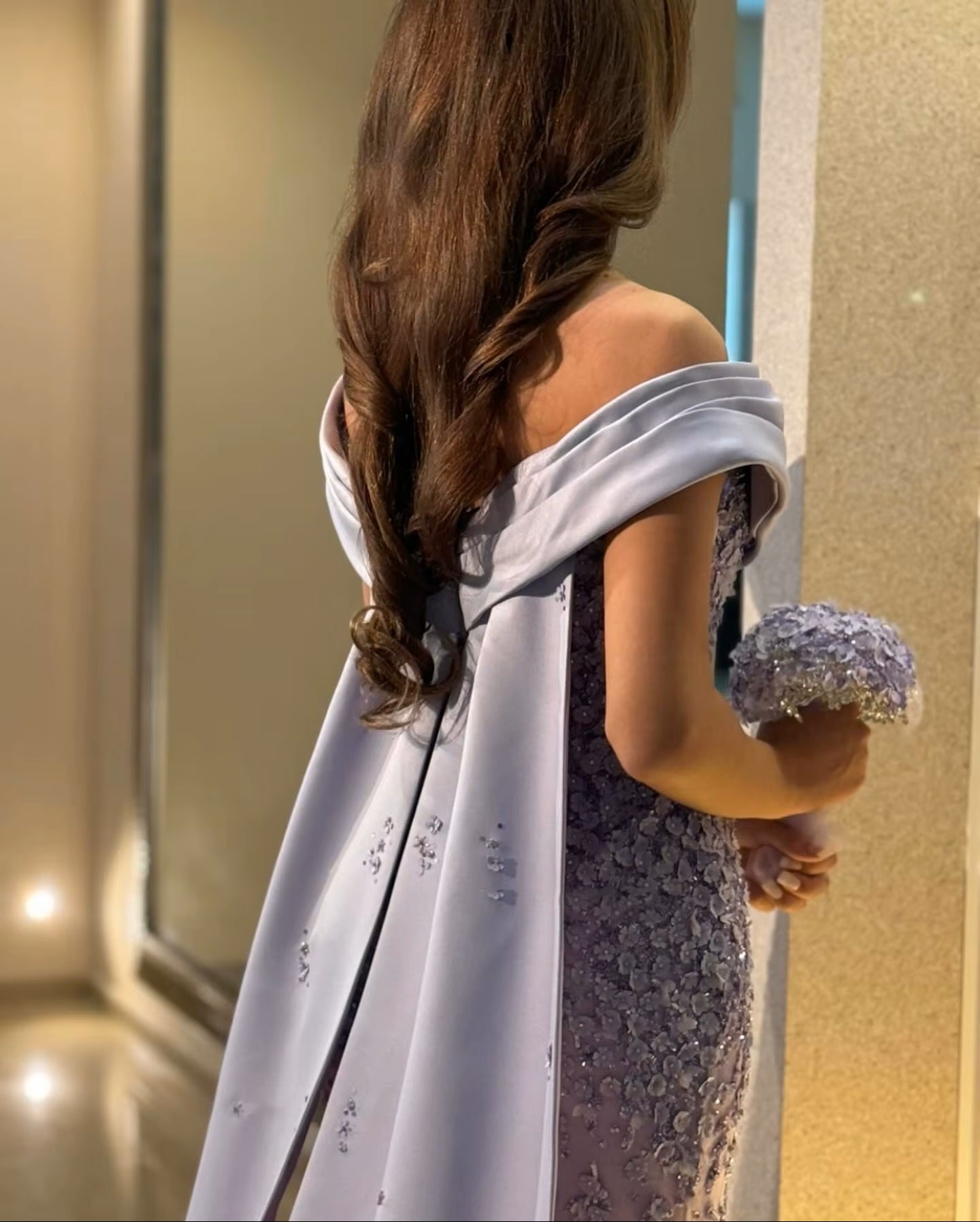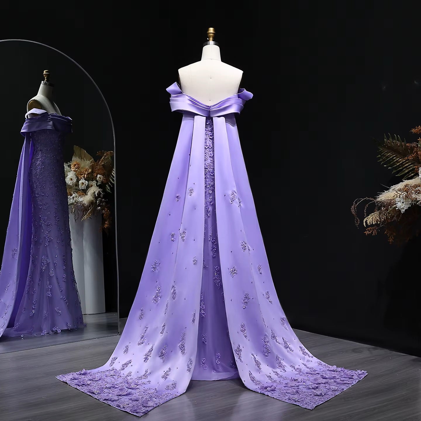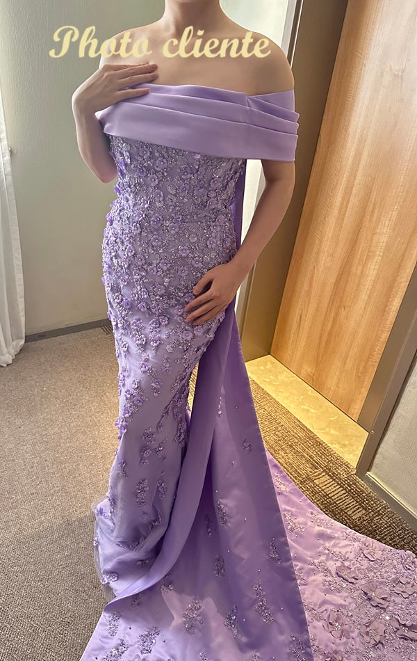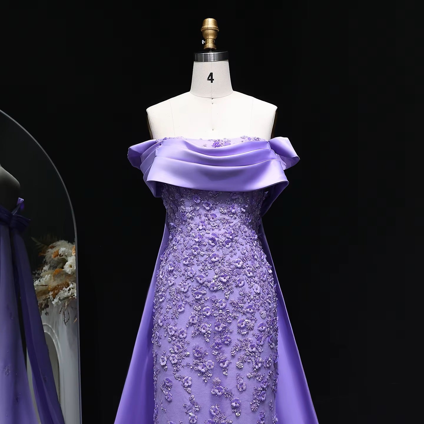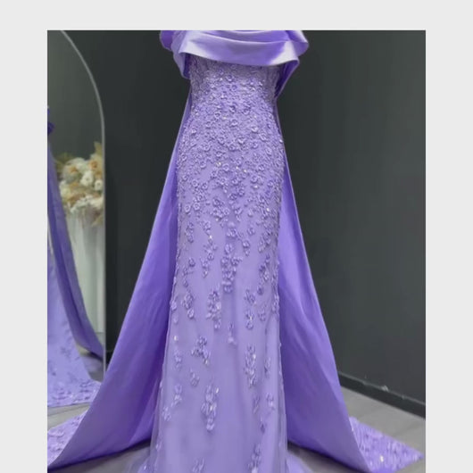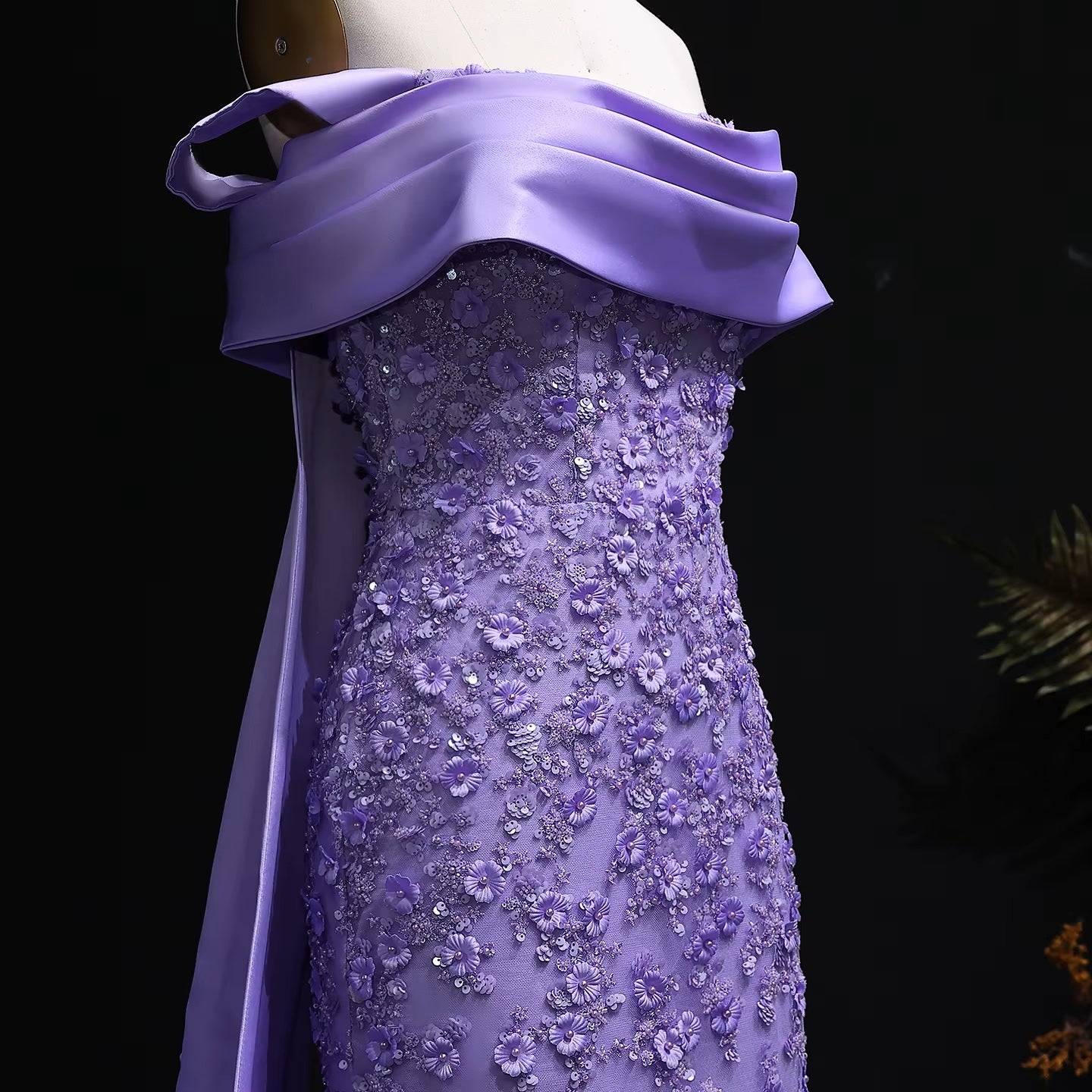 Osez l'originalité et l'élégance, avec la robe sirène CHENOA, confectionnée de satin, embellie de broderies florales et de fins éclats pailletés, déclinée dans une douce nuance lilas.