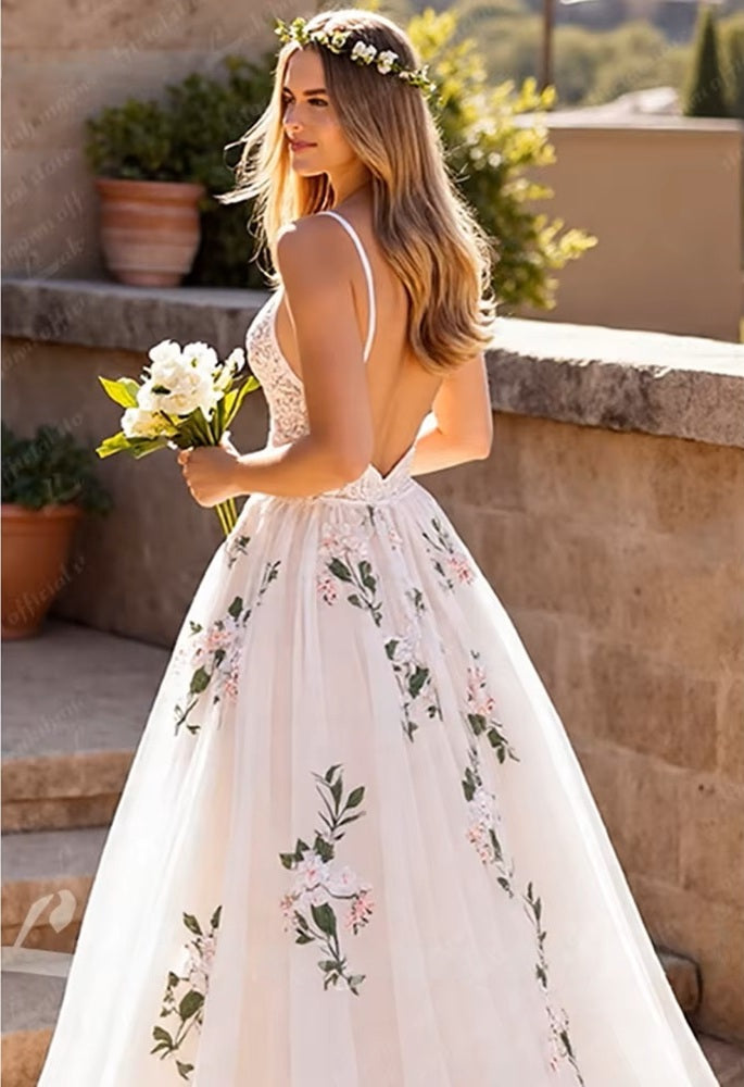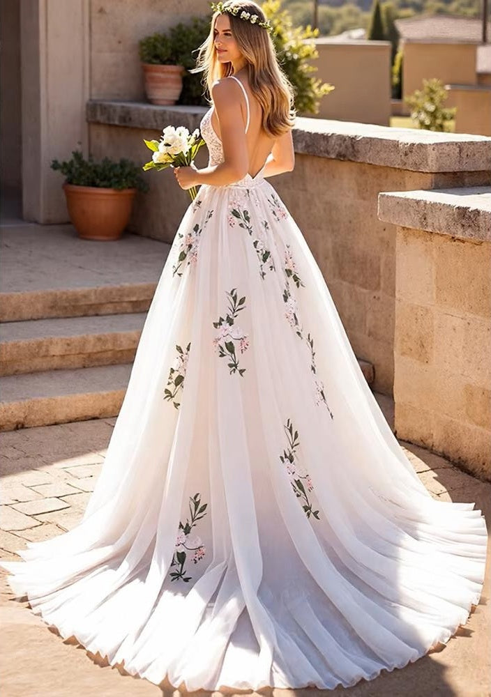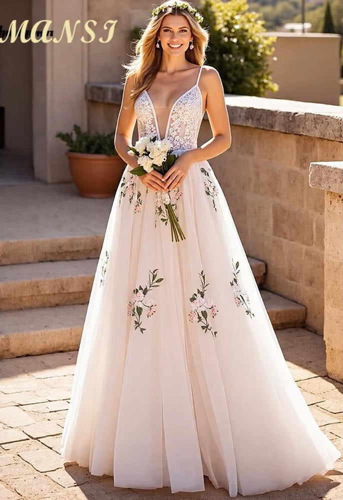 Idéale pour un mariage romantique, la robe de mariée MANSI est réalisée en tulle délicatement embellie de dentelle appliquée et parsemé d'appliques de broderies florales aux teintes pastel.