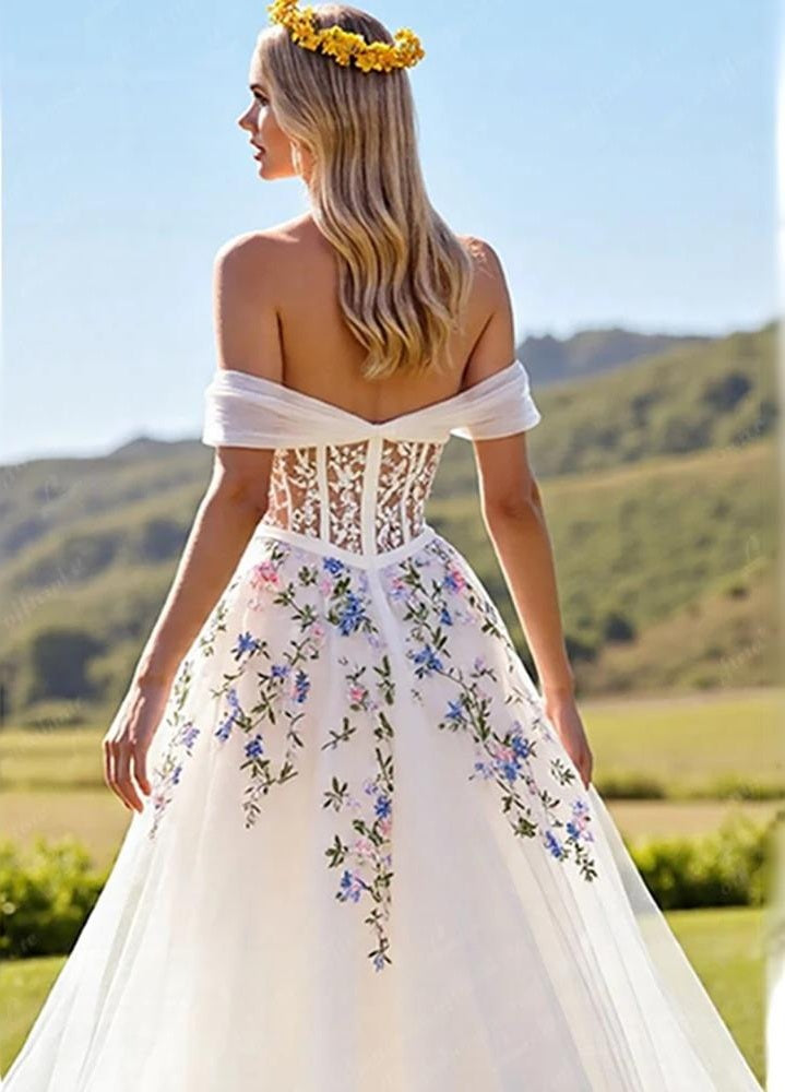 Les broderies florales se prolongent sur l'ensemble de la robe , la taille est marquée mettant en valeur la silhouette. La longueur de la jupe caresse délicatement le sol pour s'évaser en une jolie traîne.
