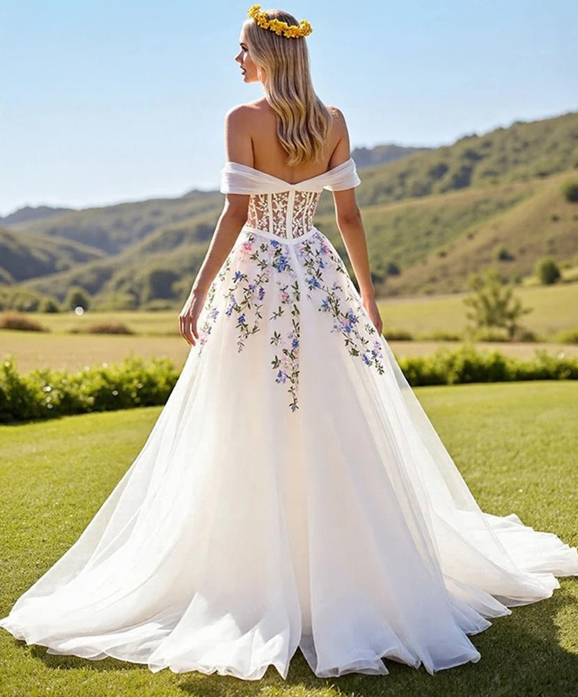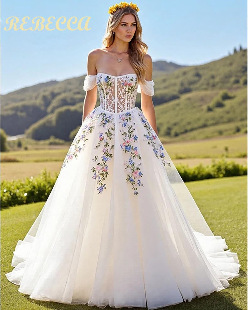 Pensée dans les moindres détails, REBECCA est une robe de mariée colorée confectionnée en tulle, délicat fond blanc cassé, parsemé de broderies florales délicates aux teintes pastel.