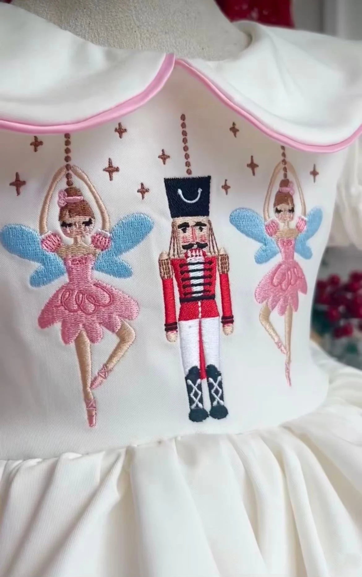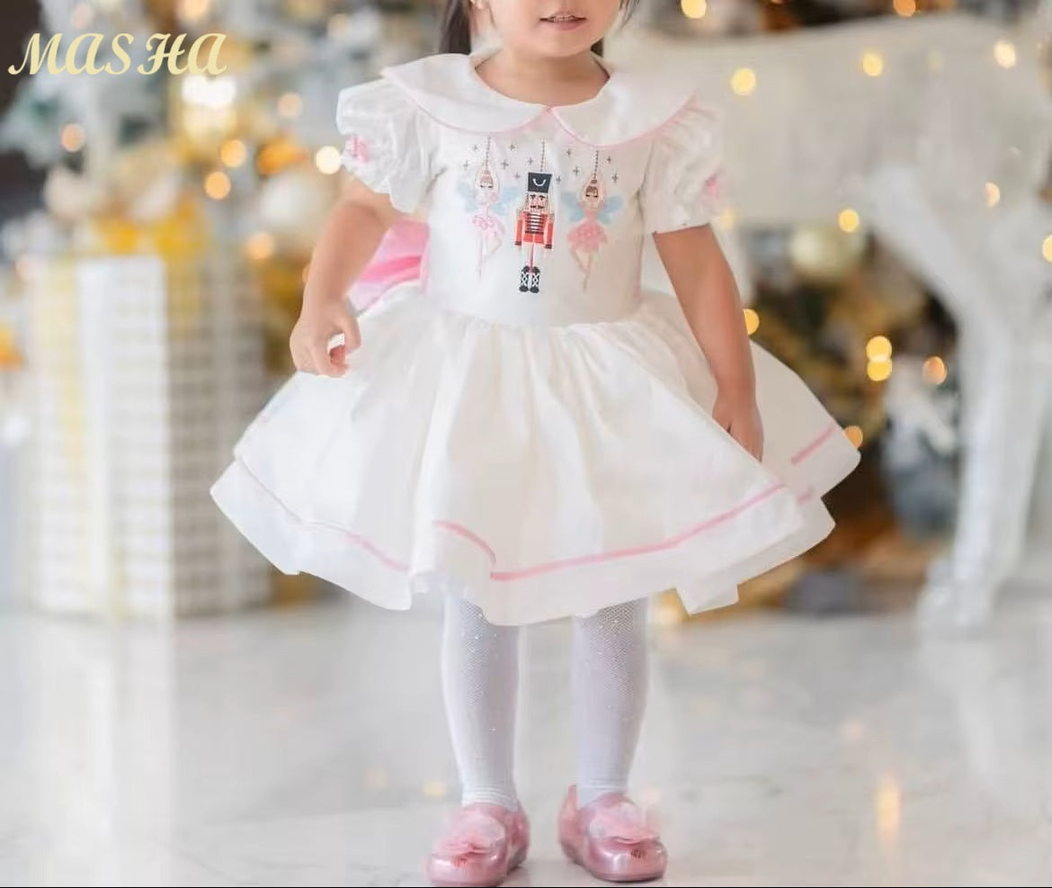 Un design stylé et féérique par sa confection dans un beau tissu de coton, qui évoque l'esprit festif et le charme enchanteur. Elle se démarque par ses manches joliment ballonnées au niveau des épaules et sa belle encolure Claudine. Son plastron majestueux brodé de motifs de ballerines et de casse noisette. Un jeu de fronces souligne subtilement la taille et donne cette ampleur que recherchent toutes les petites filles afin de virevolter sur elles-mêmes.
